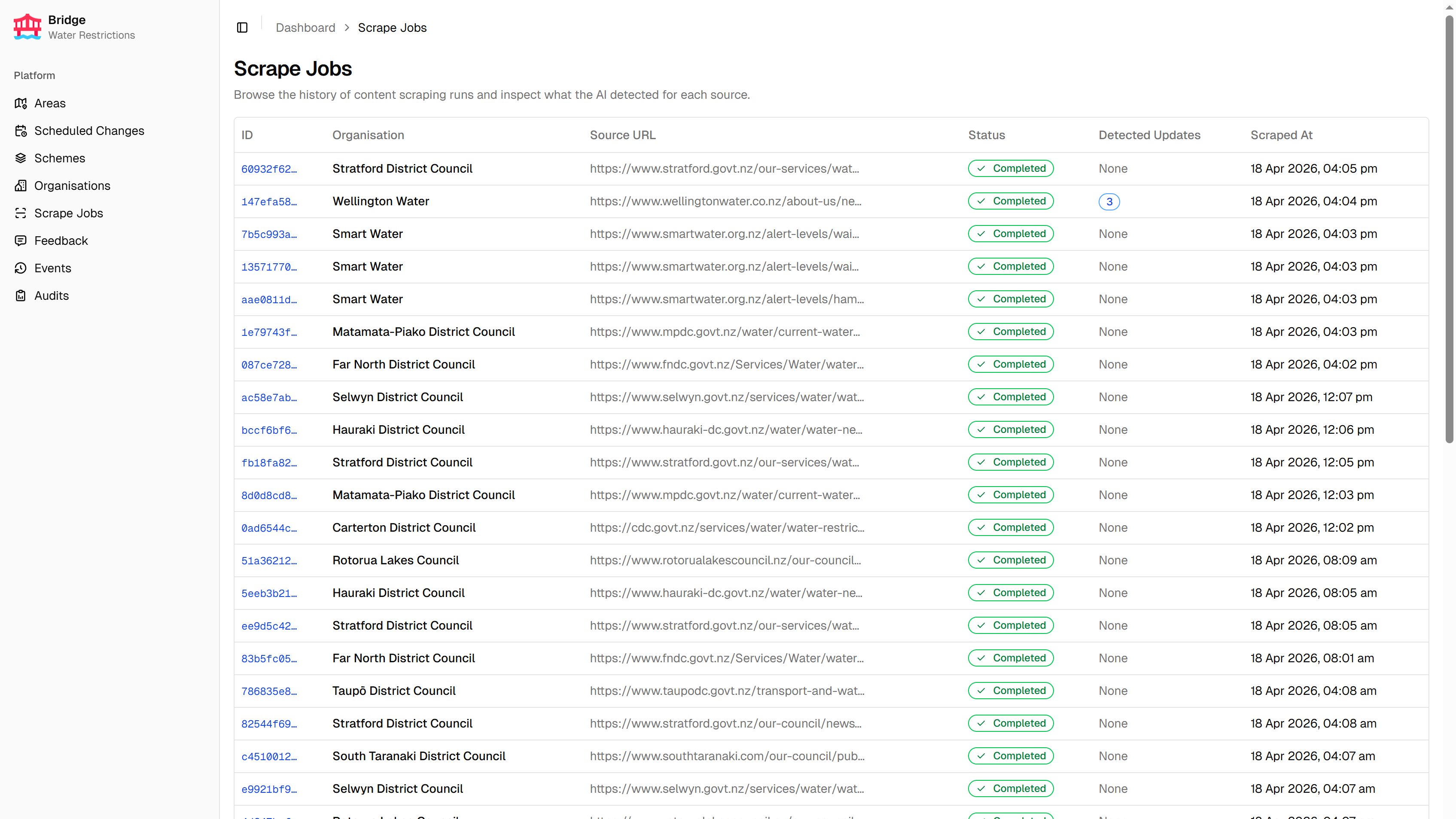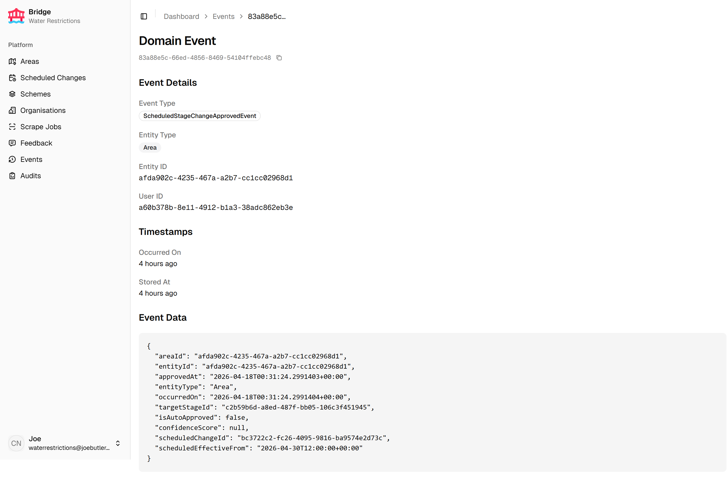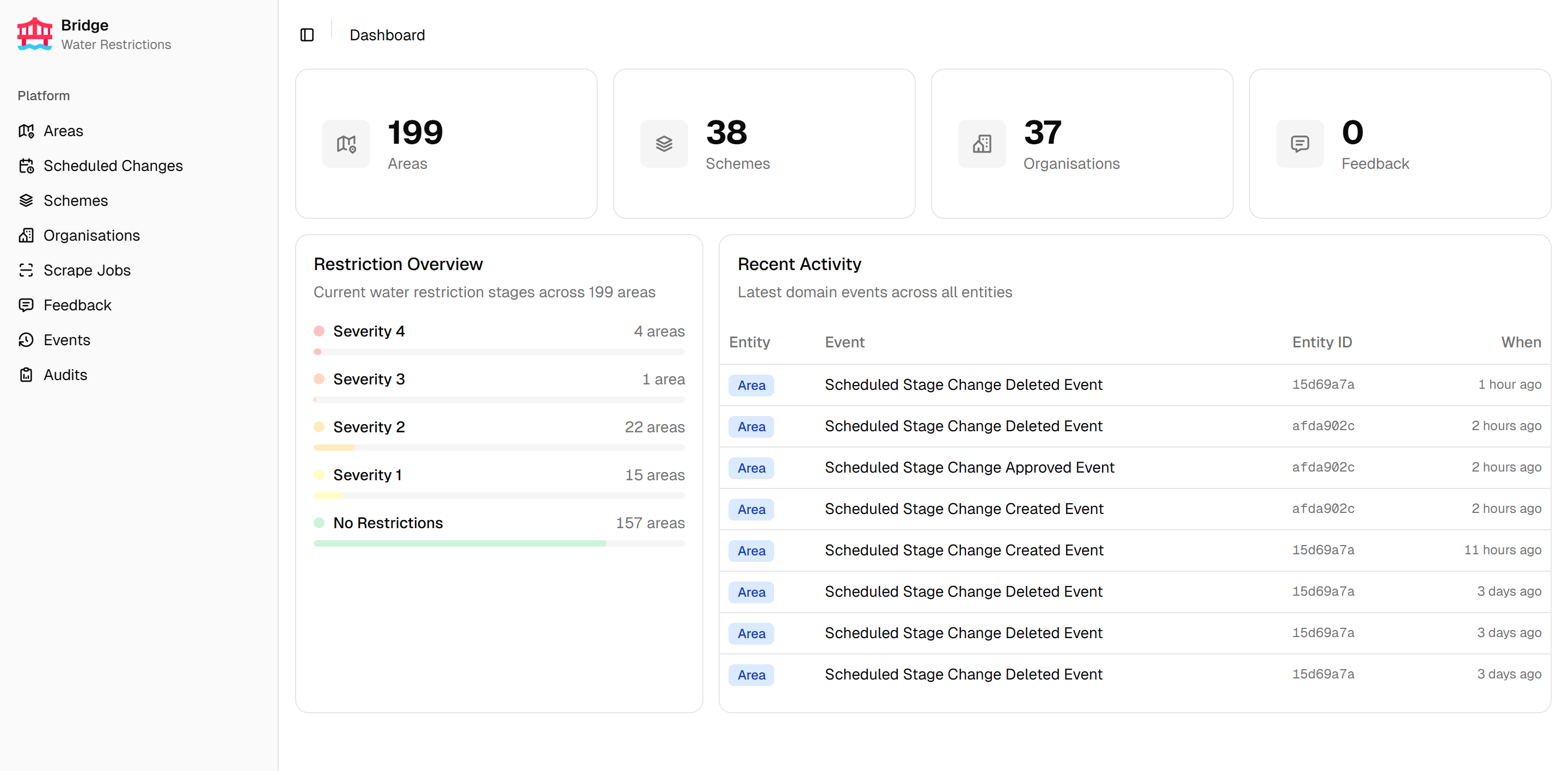 Bridge is the internal admin portal for the Water Restrictions platform. It manages areas, organisations, and restriction schemes, and is the primary tool for configuring and monitoring the scraping pipeline that powers the Water Restrictions Website. Feedback submissions from the website are reviewed and managed in Bridge, and a full domain events log provides an audit trail of all important system changes.