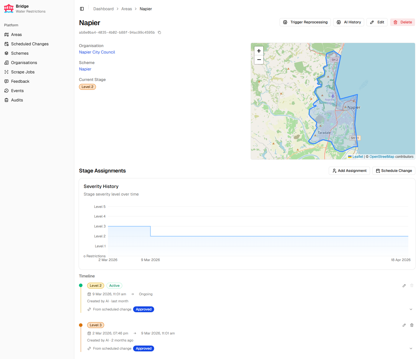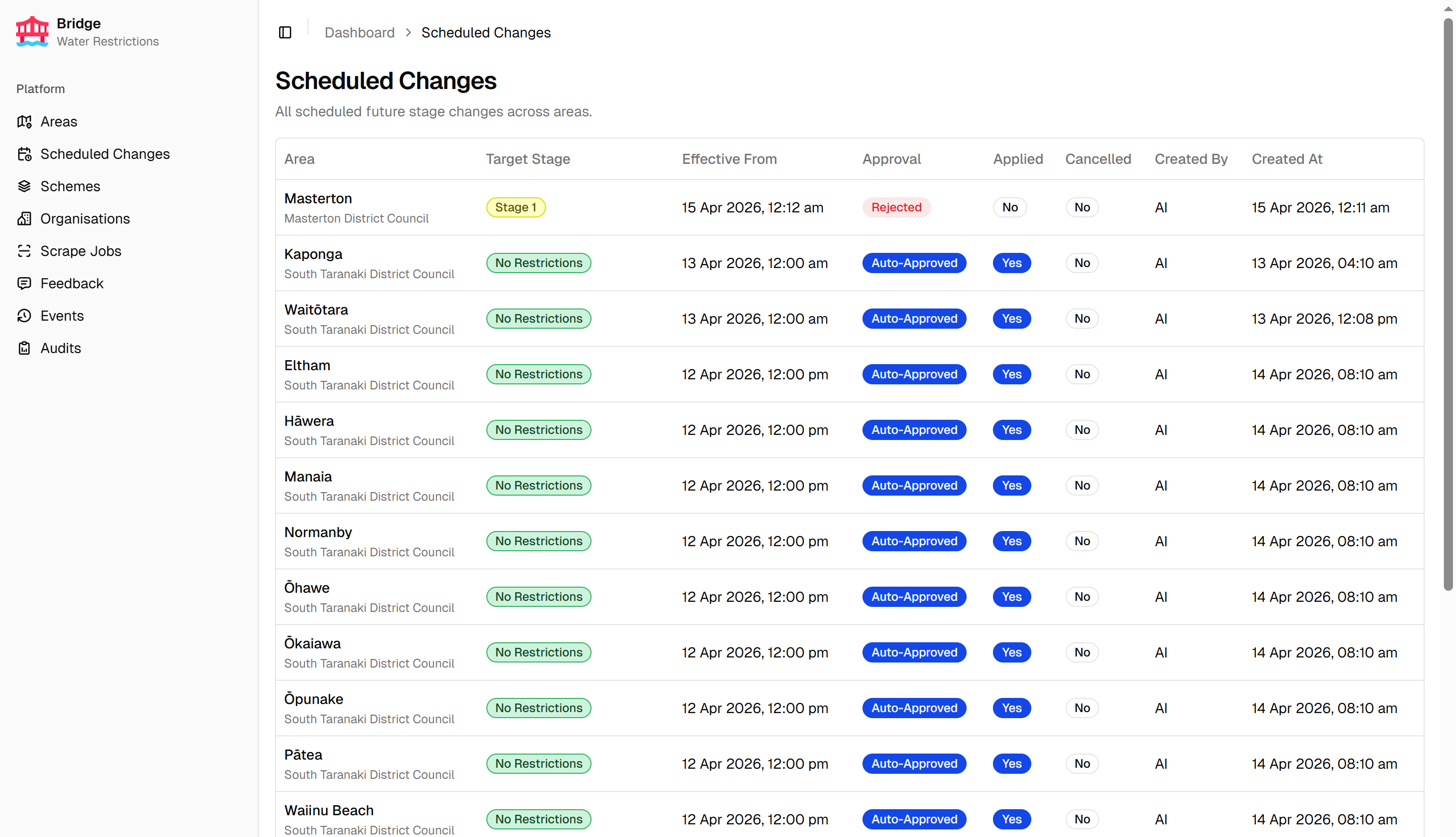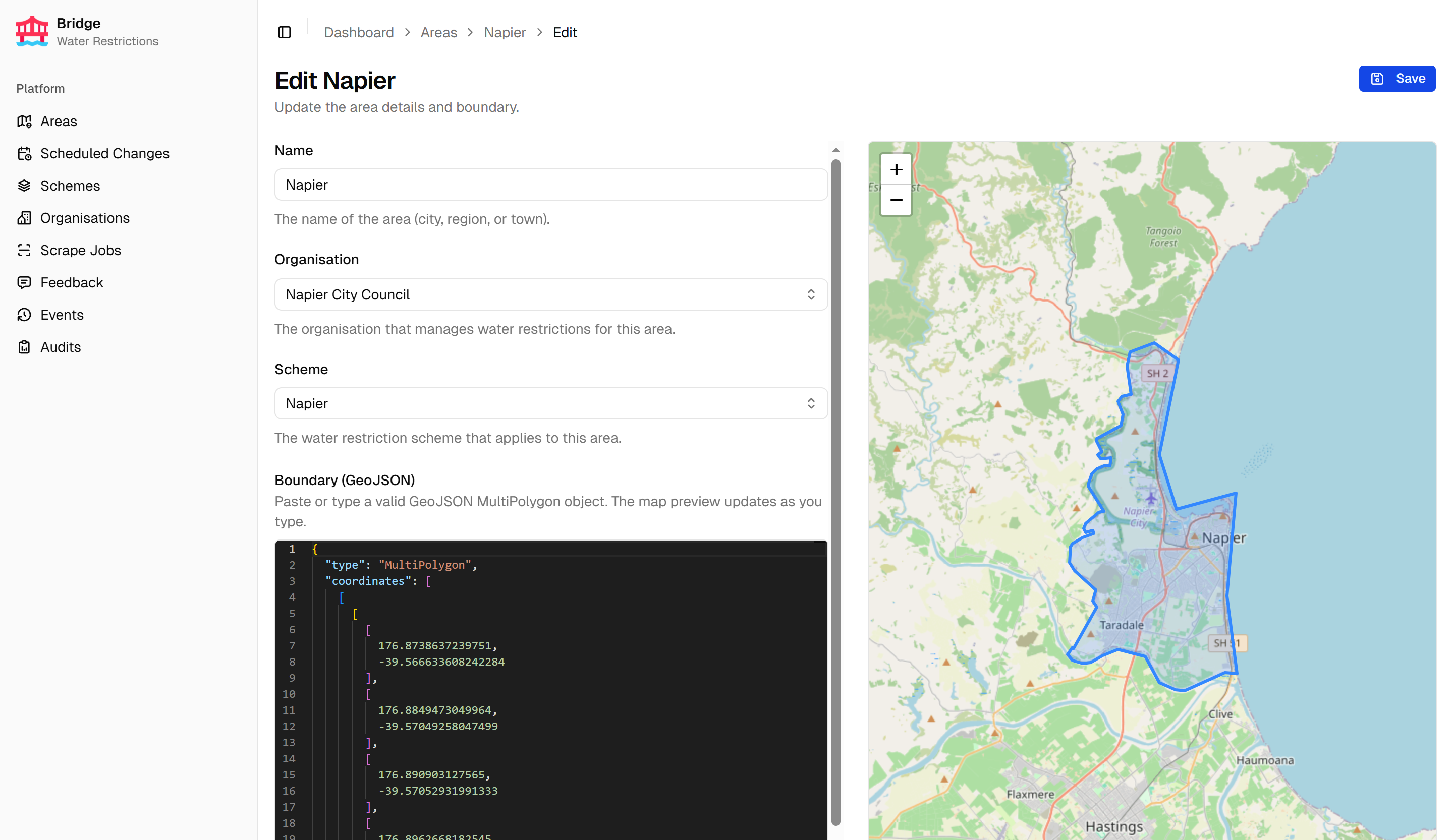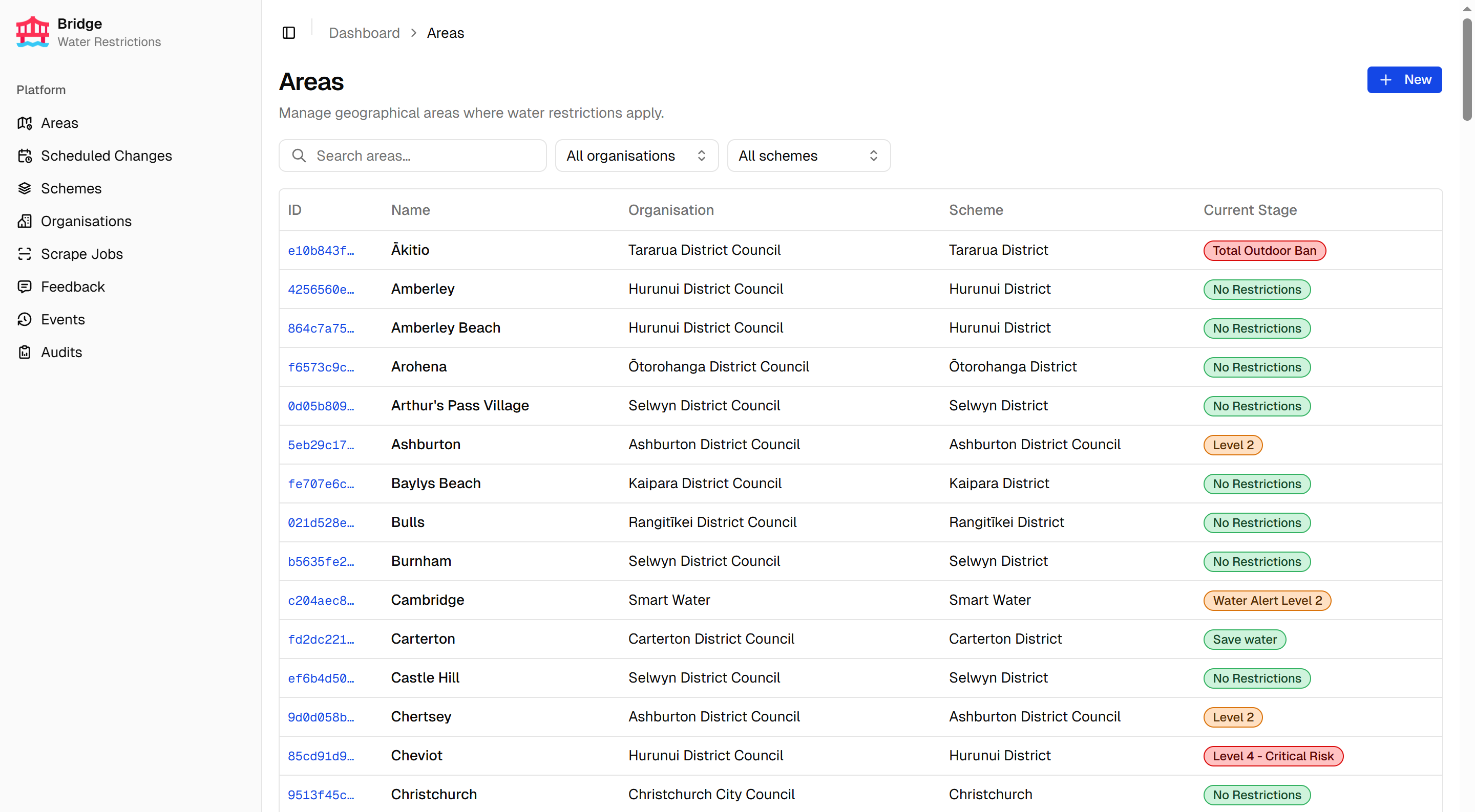 Bridge is the internal admin portal for the Water Restrictions platform. It manages areas, organisations, and restriction schemes, and is the primary tool for configuring and monitoring the scraping pipeline that powers the Water Restrictions Website. Feedback submissions from the website are reviewed and managed in Bridge, and a full domain events log provides an audit trail of all important system changes.