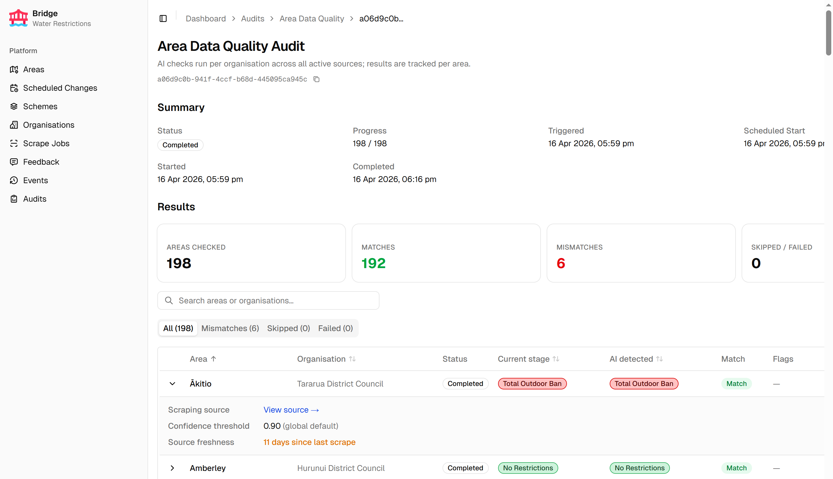 The Area Data Quality audit is triggered manually to check for drift between the API’s stored restriction data and what the scraping sources currently report. Results are tabbed by outcome, with severity mismatches surfaced in a dedicated tab. Each row expands to show the sources used and any quality flags raised.